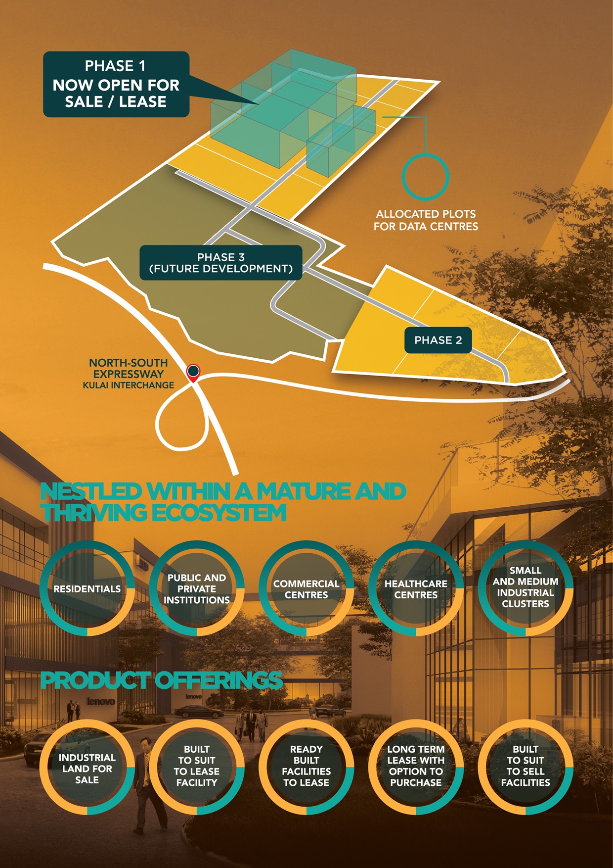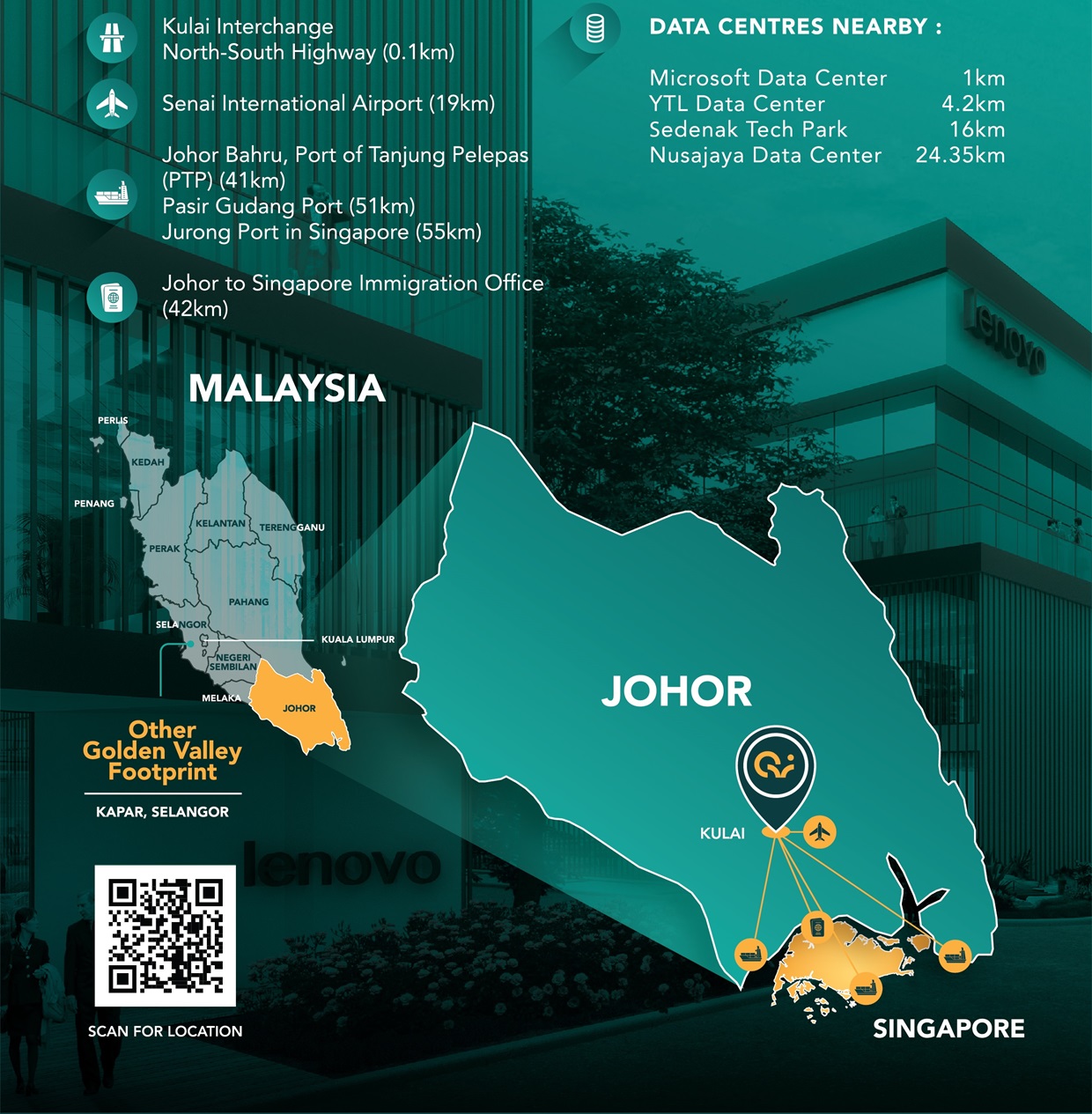 Golden Valley High-Tech Park is a 512 acres industrial development strategically located at North of Iskandar Malaysia (Northern Gateway into Iskandar Malaysia). It is strategically positioned with proximity to major ports, international airports, and highways, giving fantastic advantages.